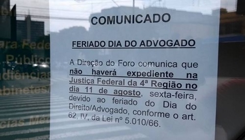Não procure a Justiça Federal de Campo Mourão nesta sexta-feira. Como 11 de agosto é o Dia do Advogado, não há expediente. Um aviso foi deixado na porta desde o início da semana. Isso só vale para a justiça federal. O fórum (justiça estadual) funciona normalmente. Uma lei de 1966 define que o 11 de agosto é feriado para o judiciário federal.