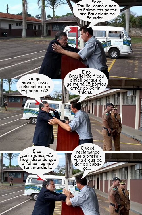 O prefeito Tauillo Tezelli e o vereador Edoel Rocha aproveitaram o evento de aniversário da Polícia Militar, na manhã desta quinta-feira, para colocar a conversa em dia. Do que eles tanto falaram? Ah, levando-se em contas que ambos são palmeirenses, deve ter sido sobre a eliminação do Palmeiras diante do Barcelona (do Equador!), pela Libertadores...
