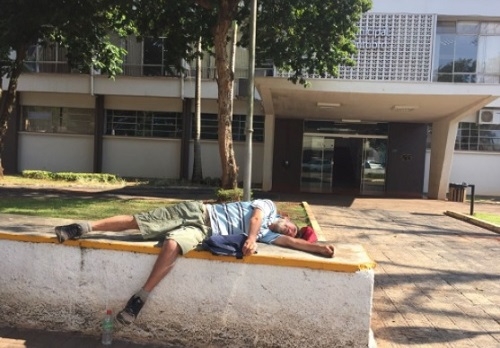 Homem dorme sobre o murinho em frente à prefeitura de Campo Mourão. A cena é desta quinta-feira, por volta das 15h.