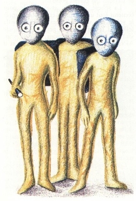 "Enquanto examinava o seu conjunto, sem, conctudo, me atrever a mexer no aparelho, verifiquei ainda uma parede deixando ver uma janela provida de vidro ou coisa semelhante. Vi, então, duas ‘pessoas’ que me examinavam com ar de curiosidade. Elas, como constatei ao primeiro olhar, eram de aspecto estranho. Decorridos alguns segundos, uma delas voltou-se para o interior do aparelho e, ao que me parece, foi falar com alguém. Imediatamente ouvi barulho dentro do veículo e uma porta, por baixo do rebordo que o circundava, se abriu dando passagem a três pessoas metidas dentro de uma espécie de macacão transparente, que as envolvia completamente, cabeça e tudo, e que estava inchado como uma câmara de ar de automóvel, cheia de ar comprimido".