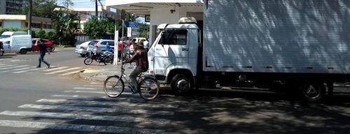 Caminhão estaciona sobre faixa de pedestre. Isso em plena av. Capitão Índio Bandeira, centrão de Campo Mourão. E por volta do meio-dia, já fora do horário de carga e descarga.