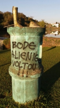 O monumento do índio no Parque do Lago faz tempo que virou nisso. Só restaram os pés da estátua. Não bastasse isso picharam o pedestal. Agora, cá pra nós: será que foi o "bode alienígena" que levou o índio?...