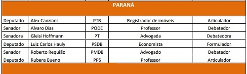 O Departamento Intersindical de Assessoria Parlamentar divulgou a nova lista dos "100 Cabeças" do Congresso Nacional. Do Paraná entrou com seis parlamentares - os três senadores e três deputados. O mourãoense Rubens Bueno mais uma vez está incluído. Segundo o Diap, Bueno se destaca como deputado "articulador". Os outros dois deputados paranaenses são de Londrina - Alex Canziani (articulador) e Luiz Carlos Hauly (formulador). Já os três senadores se destacam como "debatedores".