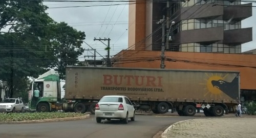 O edifício Likes ao fundo não deixa dúvidas: o caminhão está passando pelo centrão de Campo Mourão. Detalhe: na virada passou por cima do canteiro. O motorista chegou a descer para pedir informação. A cena é desta quarta-feira à tarde.