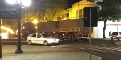 Carreta bitrem passar pela av. Capitão Índio Bandeira, centro de Campo Mourão, na terça-feira à noite. Segundo testemunhas, o motorista teria parado para se informar como sair do centro e reclamou da sinalização da cidade.