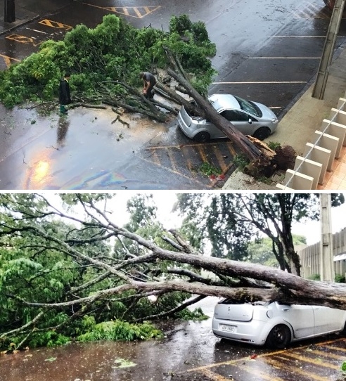 O temporal da madrugada deste sábado deixou estragos por Campo Mourão, incluindo árvores caídas pelas ruas. Uma delas, na rua Santa Catarina, em frente à antiga Agência do Trabalhador, caiu em cima de um carro.