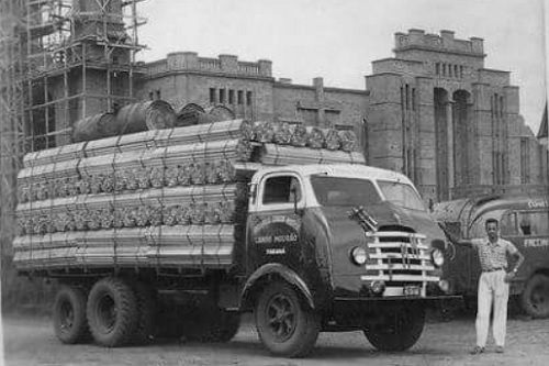 Campo Mourão está completando 70 anos e tem coisas que não mudaram nesses anos todos. Caminhão no centro é uma delas. Essa aí é dos os 60. O caminhão Fenemezão carregado "faz pose", tendo ao fundo a Catedral São José ainda em construção. Mais de 50 anos depois, Campo Mourão ainda não achou uma forma de evitar que carretas passem pelo centro. Volta e meia tem uma "desfilando" pelas avenidas centrais...