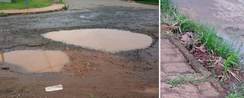 "Estado crítico na rua Vicente Zawadniak, no jardim Aeroporto. Isso que é rua de passagem do transporte público. O carnê do IPTU nunca atrasa, né, senhores responsáveis pela qualidade da rua? Há muito, muitos anos, tinha um bueiro ali..."