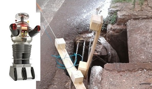 Os sensores no Robô não tiveram dúvidas e deram alerta de perigo perto da empresa Ovídio Pneus, onde a tampa do bueiro quebrou, deixando em risco quem anda pela calçada.