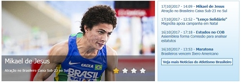 O texto é do site da Federação Brasileira de Atletismo. E aí, reparou quem ilustrou a matéria? É o mourãoense Mikael de Jesus. O texto lembra que ele é líder dos 400 m com barreiras, com 50.12. "O atleta ganhou a medalha de bronze no Troféu Brasil Caixa de Atletismo no dia 11 de junho, com 50.41", completa.