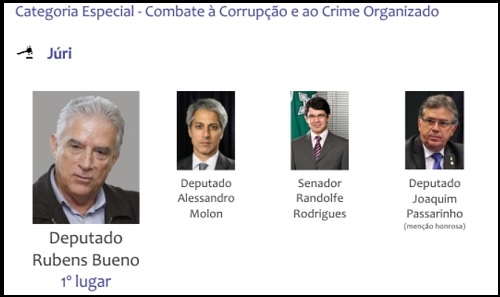 Qual foi o deputado que mais se destacou este no no combate à corrupção e ao crime organizado? Segundo júri do portal "Congresso em Foco" foi o mourãoense Rubens Bueno. A entrega da premiação aconteceu nesta quinta-feira, em Brasília. Bueno ainda apareceu entre os parlamentares mais bem avaliados, de forma geral, pelo júri. Também houve a premiação pelo voto popular, através da internet.