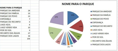 ..."Parque dos Lagos". A nome teve 34 votos (22%) e venceu a enquete realizada pela prefeitura de Corumbataí do Sul através do Facebook. A votação foi encerrada nesta sexta-feira. O prefeito Carlos Caxão informou que a inaugurção vai ocorrer nos próximos dias. A enquete deu 10 opções de nomes e houve 156 votantes. Recanto das Águas ficou em segundo, com 27 votos, e Parque da Amizade em terceiro, com 24.