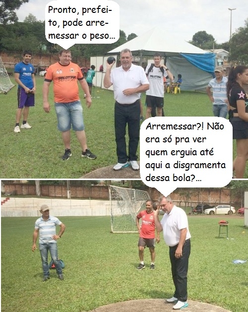 Os cliques são do fimde semana, quando o prefeito Baco Duarte (Ubiratã) foi ao estádio municipal conferir as provas de atletismo dos Jogos Abertos Municipais (Jamu"s). O secretário de Esporte e Lazer, Nicanor Kimura, destacou o sucesso dos Jamu"s até o momento. E o prefeito ainda se arriscou no arremesso de peso...