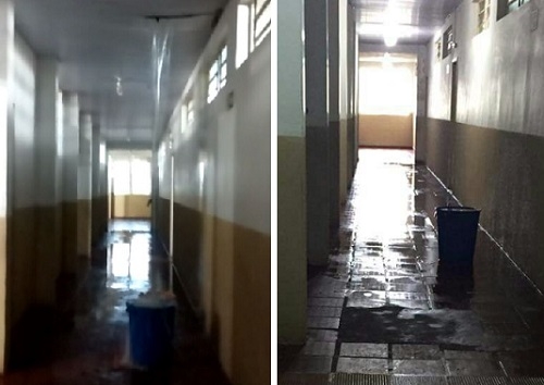 Chovendo, não! Despencando água. A imagem, desta quinta-feira, é do corredor entre salas de aula da escola municipal Parigot de Souza, no jardim Gutierrez. A calha entupiu e deu nisso. Haja balde!