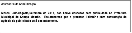 A prefeitura de Campo Mourão publicou nesta sexta-feira o relatório da Assessoria de Comunicação com os gastos no terceiro trimestre em publicidade e propaganda. Total: zero. Isso mesmo: nada, nada, nada! O segredo de tanta economia? A prefeitura não tem agência de publicidade licitada. Sem agência, não pode fazer propaganda, não. A situação vem desde o final da gestão Regina Dubay.