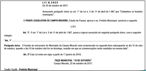 O dia 10 de outubro não é mais feriado em Campo Mourão.