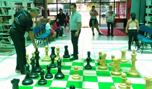 Quarenta enxadristas participaram do torneio de xadrez em comemoração aos cinco anos do Centro da Juventude de Campo Mourão. O título ficou com Anderson Hertz, empresário que faz parte da diretoria do Campo Mourão Futsal. Na foto, o secretário Marcela Lima (Espores) joga no tabuleiro gigante com o médico Homero Cesar Cordeiro, que é conselheiro da Associação Mourãoense de Xadrez. O presidente é Jheneyson Denis.