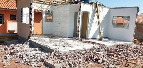 Essa é uma da 80 casas populares do conjunto que foi inaugurado sexta-feira da semana passada em Terra Boa. O evento teve a presença do governador Beto Richa e tudo. Uma semana depois, a página JN Terra Boa, no Facebook, traz essa e outras fotos e a informação que a moradia foi parcialmente desmanchada porque o mutuário fará ampliação no imóvel.