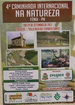 Tem Caminhada Internacional na Natureza neste domingo em Fênix. É a quarta edição do Circuito Vila Rica do Espírito Santo, numa promoção da Emater e da prefeitura. O percurso tem cerca de 14 km entre entradas rurais, trilhas na mata nativa e o Parque Estadual de Vila Rica do Espírito Santo. A saída será às 8h, na Arcam, que fica no trevo de entrada da cidade. A caminhada é gratuita, mas existem opções de café da manhã (R$ 10) e almoço (R$25).