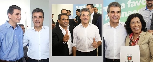 O governo do Estado reuniu prefeitos durante a semana para anunciar a liberação de recursos. Vários da região estiveram por lá. Saiu dinheiro para pedras irregulares, asfalto, caminhão para coleta seletiva, semeadeira, veículos ou simplesmente tubos de concreto. Nas fotos com o governador Beto Richa: Rafael Bolacha (Moreira Sales), Zé do Caixão (Boa Esperança) e Suely Pereira (Rancho Alegre do Oeste).