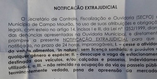 Ameaça de apreensão - A notificação é assinada pelo secretário Cristiano Calixto (Fiscalização) e foi entregue no último dia 20. O documento diz que há reclamações contra o trabalho do garapeiro e fala em apreensão dos equipamentos em caso de desobediência.