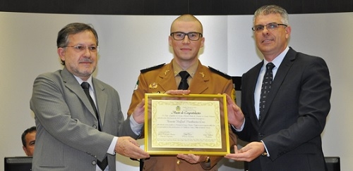 Teve entrega de moção na sessão da Câmara desta terça-feira. Foi para o tenente Rafael Cruz, que trabalhou no ao 11º Batalhão da Polícia Militar. A homenagem foi entregue pelo vereador Edilson Martins, autor da moção, e pelo prefeito Tauillo Tezelli. Cruz deixou Campo Mourão há um ano, mas fez um discurso dedicado à cidade. Encerrou ao estilo do ex-prefeito Nelson Tureck: "Viva Campo Mourão!"...