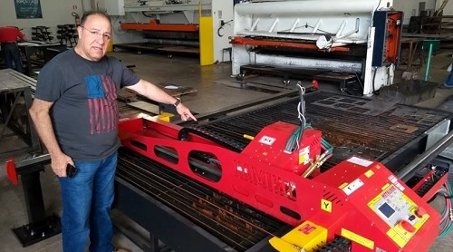 Olha o empresário Alcione Jacob de Souza aí, faceiro com a mais nova aquisição da empresa Força do Aço. Trata-se de uma máquina que faz "corte plasma". O equipamento corta chapas de até 12 milímetros. E não é só corte reto, não. É possível fazer qualquer desenho, como letras, por exemplo. Dá até para fazer o corte na chapa em forma de escudo do Corinthians, se bem que será mais fácil conseguir um desconto do Alcione se for do Palmeiras...