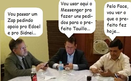 Após sessão da Câmara desta terça-feira, que incluiu entrega de moção ao tenente Rafael Cruz, o prefeito Tauillo Tezelli e os vereadores Edoel Rocha e Sidnei Jardim jantaram juntos. Aproveitaram para colocar a conversa em dia, certo? Ah, pelo foto feita pelo vereador Edilson Martins, aproveitaram para colocar o Whats App em dia, isso sim...