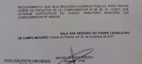 O vereador Miguel Ribeiro protocolou nesta quarta-feira pedido de audiência pública sobre o aumento do IPTU.