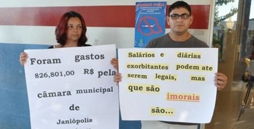 Teve protesto nesta segunda-feira na Câmara de Vereadores de Janiópolis. Um grupo de moradores compareceu com cartazes criticando os gastos dos legislativo. Eles defenderam a redução do salário do vereadores para um salário mínimo - R$ 937. Abaixo-assinado nesse sentido está sendo realizado no município.