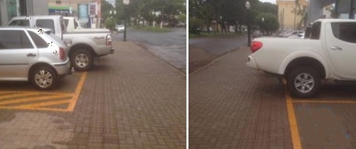 Na av. Guilherme de Paula Xavier camionetonas estacionam em vagas recuadas das calçadas, mas como ela são maiores que o espaço ficam sobre a guia destinada a pessoas com deficiência visual.