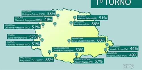 A RPC/Globo mostrou no “Paraná TV – 1ª edição” o mapa do Estado com os prefeitos eleitos nas “principais” cidades paranaenses. Tem Cianorte, Umuarama, Paranavaí, Toledo, Pato Branco, Francisco Beltrão, Guaratuba e até União da Vitória. Nada de Campo Mourão. Magoa, não magoa? Ah, vá ver estão achando que tem segundo turno por aqui...