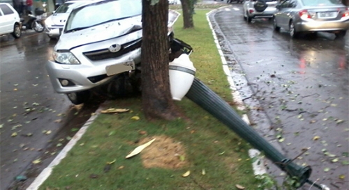 A semana começa com mais um poste republicano detonado no centro de Campo Mourão. Foi na av. Manoel Mendes de Camargo, na tarde desta segunda-feira. O motorista do Corolla teria cochilado, o carro saiu da pista e parou ao encontrar o poste pelo caminho.