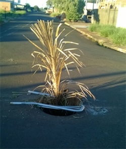 Coqueiro crescendo no bueiro no meio da rua do jardim América, em Campo Mourão.