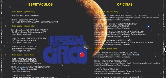 Começa nesta quarta-feira o 9º Festival de Circo de Campo Mourão. A abertura será às 20h, no Teatro Municipal, seguida com apresentação da Trupe da Fundacam com o espetáculo “Loading”. O evento vai até sábado, com apresentações no teatro e na praça São José. Também haverá oficinas. Estão confirmadas trupes de Curitiba, Londrina, Toledo e da Escola Nacional do Circo, do Rio de Janeiro.