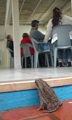 O foto é deste sábado. Choveu tanto pela manhã que até um sapo apareceu para conferir uma reunião da prefeitável Regina Dubay na região do jardim Maia. Repare que, apesar de ter ficado do lado de fora, o bicho estica o pescoço para conferir tudo.