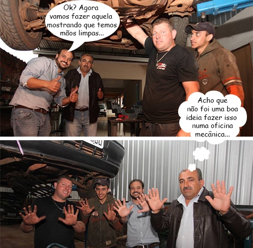 As fotos são do Facebook do prefeitável Rodrigo Salvadori (PSD) e mostram e ele e seu candidato a vice-prefeito, Isidoro Moraes, durante visita a uma oficina mecânica. As mãos abertas são para sinalizar o número da campanha. Pode ser mãos limpas também, mas não numa oficina mecânica, né?...