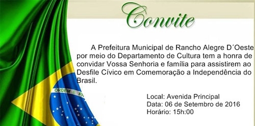 A prefeitura de Rancho Alegre do Oeste fará um Desfile da Independência diferente. Ao invés da quarta-feira, 7 de Setembro, o evento será nesta terça-feira (15h), véspera do feriado. O desfile começa na av. Paraná e termina com apresentações culturais na praça da Matriz.