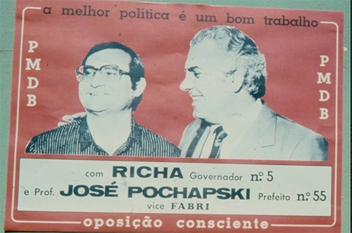 Santinho do professor José Pochapski, nas eleições de 1982, quando ele se elegeu prefeito de Campo Mourão com larga margem de votos. O prefeitável aparece ao lado de José Richa, que foi eleito governador naquele mesmo ano. As eleições de 82 elegeram de vereador a governador, passando por deputado estadual, federal e senador, além de prefeito. Para eleições gerais faltou presidente da República, o que não existia, já que eram tempos da ditadura militar.