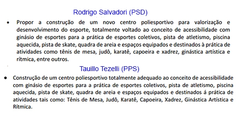 Na área de esportes, tem uma proposta de centro poliesportivo que parece plágio uma da outra.
