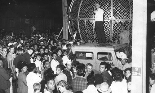 Faltando um mês para a eleição, o historiador Jair Elias do Santos Jr abre seu baú e traz pra gente fotos e reproduções de materiais de campanha do passado em Campo Mourão. Essa aí é de 1968, quando Horácio Amaral foi candidato único a prefeito. O discurso é no globo da morte do vereador Zamir Teixeira. O que é que achou? Comício com globo da morte!...