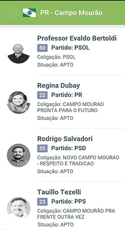Faltando duas semanas para as eleições, finalmente os quatro candidatos a prefeito de Campo Mourão apareceram no site do TSE como “aptos”. No caso de Regina Dubay, o registro dela entrou com recurso devido ao indeferimento do candidato a vice-prefeito Nelson Tureck (o mérito ainda não foi julgado). Para vereador, dos 168 candidatos, vários ainda aparecem com “aguardando julgamento”, mas indeferidos até agora apenas um, que já entrou com recurso para se manter na disputa.