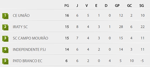 O líder, com 16, é o União de Francisco Beltrão, justamente o próximo adversário do Sport.