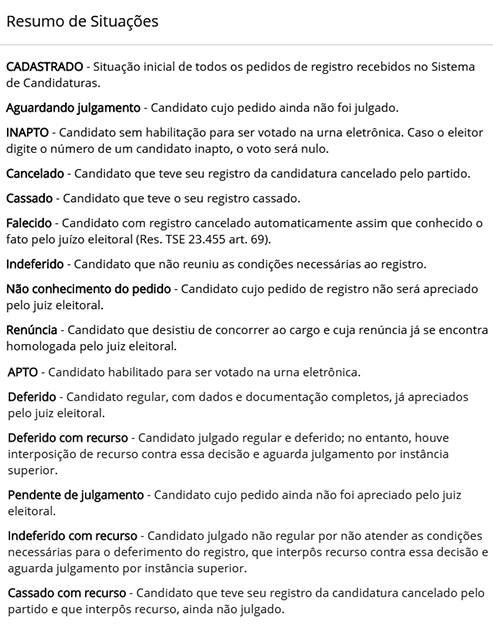 Muito se tem falado nos últimos dias (principalmente nas redes sociais) sobre a situação do registro dos candidados. Sobre quem está apto, quem não está, quem está deferido ou indeferido com recurso e o que significa tudo isso. No portal do TSE tem um glossário que explica de forma simplificada o que quer dizer cada uma dessas situações. Veja acima. Se bem que, em se tratando de Facebook, não vai faltar gente dizendo que o TSE tá errado...