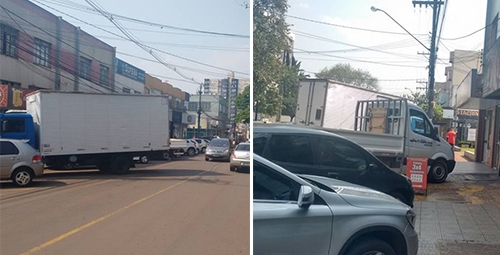 Rua São Paulo, centro de Campo Mourão, ao meio-dia desta quarta-feira. Um caminhão furgão estaciona na vaga diagonal e deixa toda a traseira sobre a pista. Já outro caminhão, ao lado, para não deixar a traseira no meio da rua, fica com a cabine sobre a calçada. Moral da história: caminhões, mesmo os menorzinhos, e estacionamento diagonal não combinam...