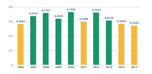 A média que era de 0,5676, em 2014, ficou em 0,5434 em 2015.