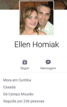 Ellen Homiak ficou famosa do Paraná nos últimos dias. Foi presa em Curitiba suspeita de matar o marido, que era policial militar. O corpo dele foi achado no fim de semana, numa área rural de Araucária. Estava esquartejado e colocado em sacolas plásticas. Nesta segunda-feira, ela confessou o assassinato. Detalhe: no perfil no Facebook, Ellen aparece como sendo natural de Campo Mourão. Aliás, na rede social, depois do marido morto, ela postou que estava sofrendo com a ausência dele. O casal tinha um filho.
