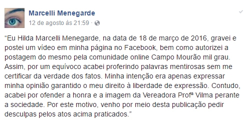 Internauta postou no Facebook retratação com pedidos de desculpas à vereadora Professora Vilma. Tudo por causa de um vídeo que essa mesma internauta tinha publicado em março, com ofensas à vereadora. Vilma levou o caso ao Juizado Especial. Na fase de instrução houve acordo no sentido de que fosse publicada a retratação. “... por um equívoco acabei proferindo palavras mentirosas sem me certificar da verdade dos fatos”, escreveu a internautada.