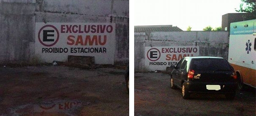 Olhando para a foto da esquerda dá a impressão que, desta vez, o aviso pintado no muro foi respeito e nenhum “estranho no ninho” deixou seu carro no estacioanamento do Samu de Campo Mourão. Nã-nani-nanã! Foi só uma questão de ângulo. À direita aparece o veículo em lugar que não devia. Isso acontece direito e, não raras vezes, atrapalha a saída das ambulâncias. Como diria Cléber Machado: “Hoje não... hoje sim!”...