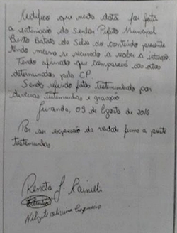 A “guerrinha” entre vereadores de Juranda e o prefeito Bento Batista teve novo capítulo nesta quinta-feira. Desta vez foi publicada declaração que o prefeito teria se recusado a receber a intimação para ir depor à Comissão Processante aberta contra ele. Apesar disso, o documento frisa que Batista afirmou que vai comparecer aos atos da CP. O documento destaca que os fatos foram testemunhados por “diversas” pessoas e por “gravação”. Batista já disse em entrevista que a comissão tem cunho político-eleitoral.